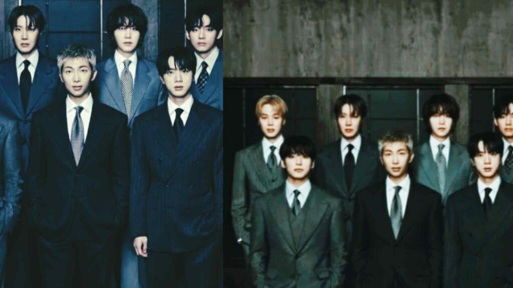 The newly revealed album covers present BTS in sleek suits, gazing directly at the camera. Stripped of whimsical elements or graphics, the imagery shows the group together in their dapper attire—matching their animated counterparts and symbolizing their connection to both the story and the ARIRANG theme.